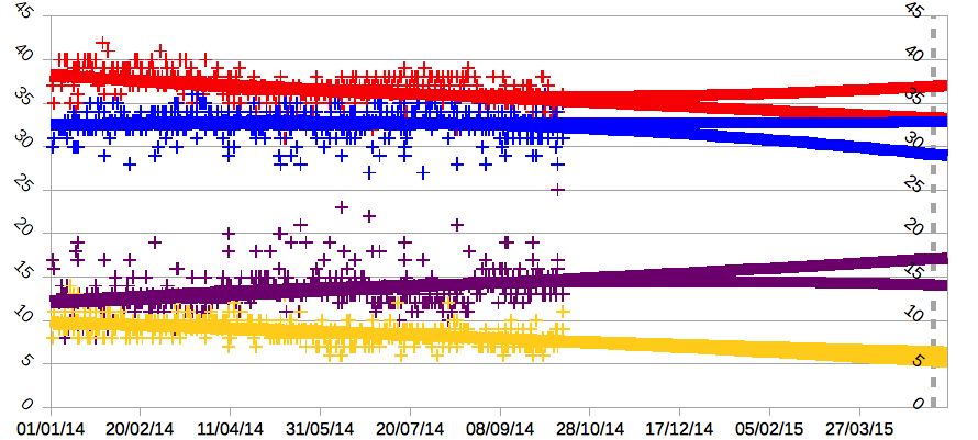 Known problems with the model so far: SNP seat projections are problematic, and probably benefiting Labour a fair amount, but this is hard to fix without special casing SNP marginals. UKIP seats don't include any wins in ByElections, again this would require special casing to try and predict if they will retain them at the General Election. The Polynomal trend line can not be used in the election simulation for technical reasons, so Labour's vote share is probably a little low. This probably compensates for phantom gains from the SNP now, but probably not closer to the election. However, this is a tiny number of seats being predicted, and within variation of any close result.